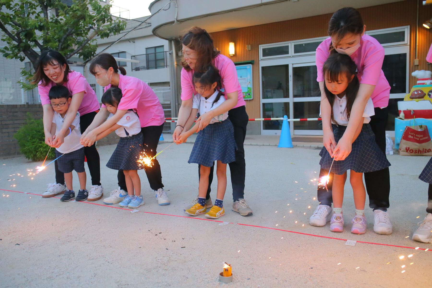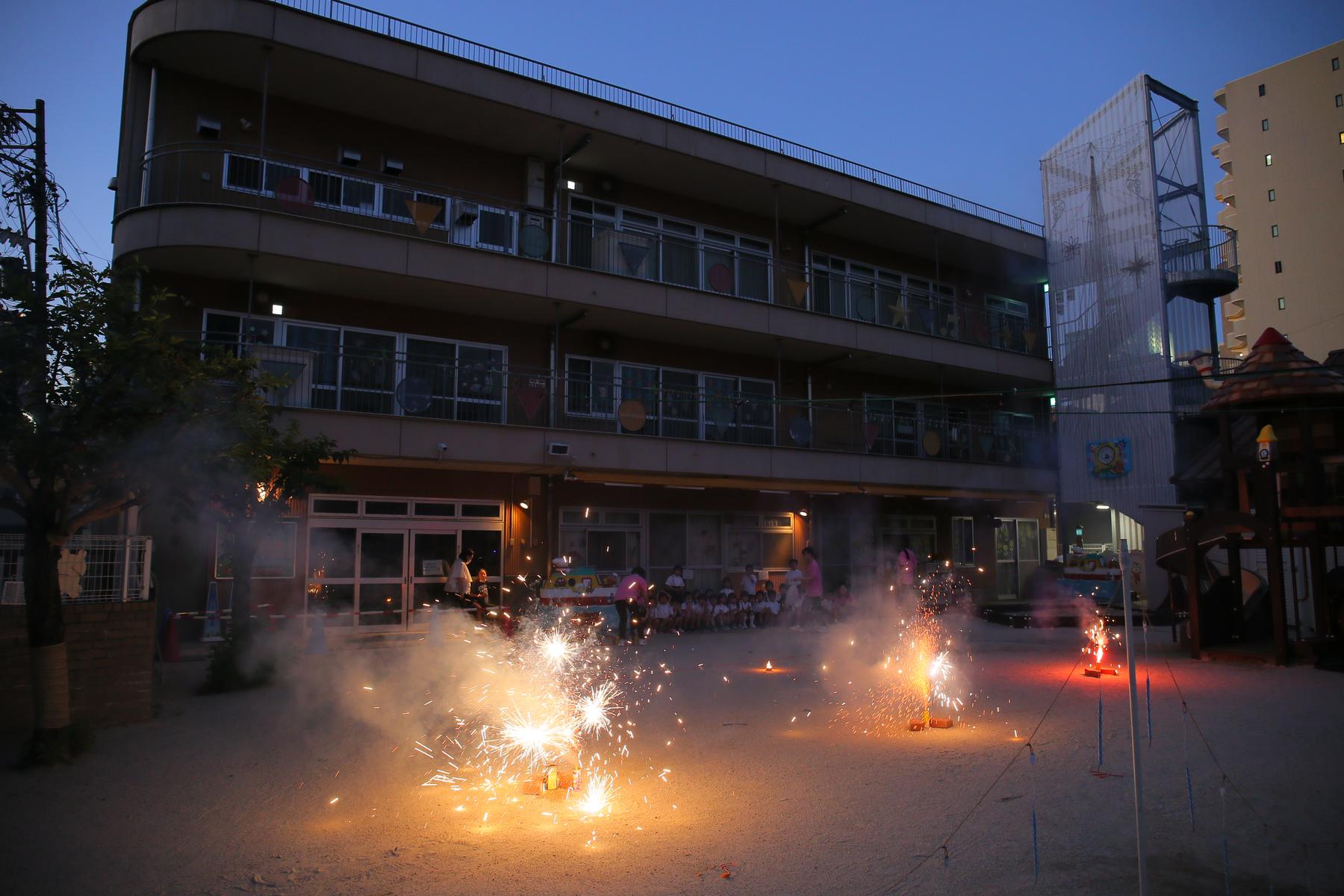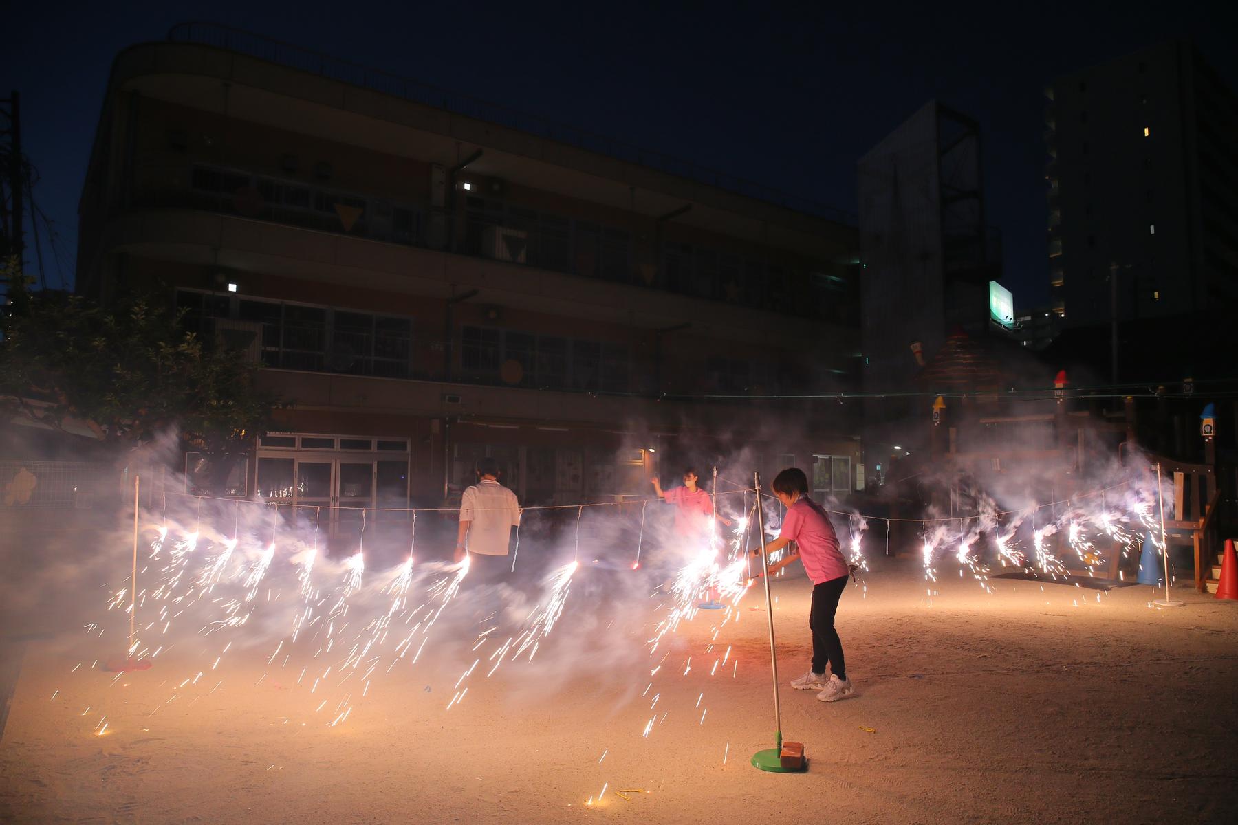手持ち花火をみんなで行い、噴出花火を見ました。最後のナイアガラの花火はとてもきれいで感動していた子ども達。