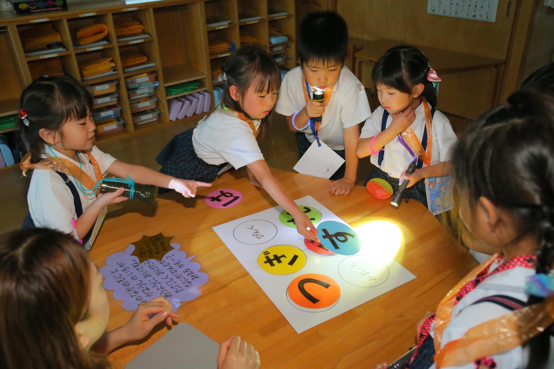 お気に入りの自分の懐中電灯を持ち、少し暗い保育園の中を問題を解いて回りました。