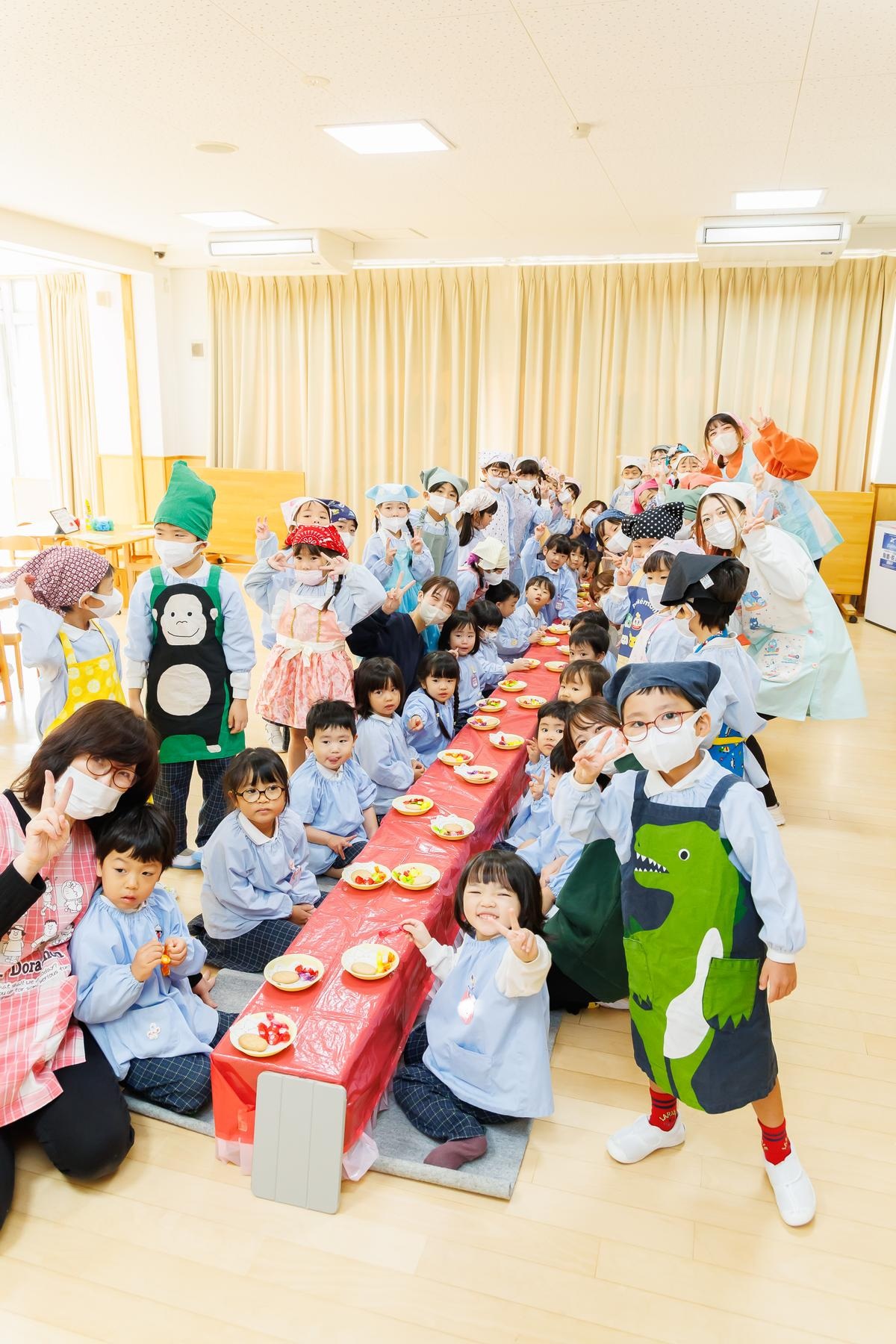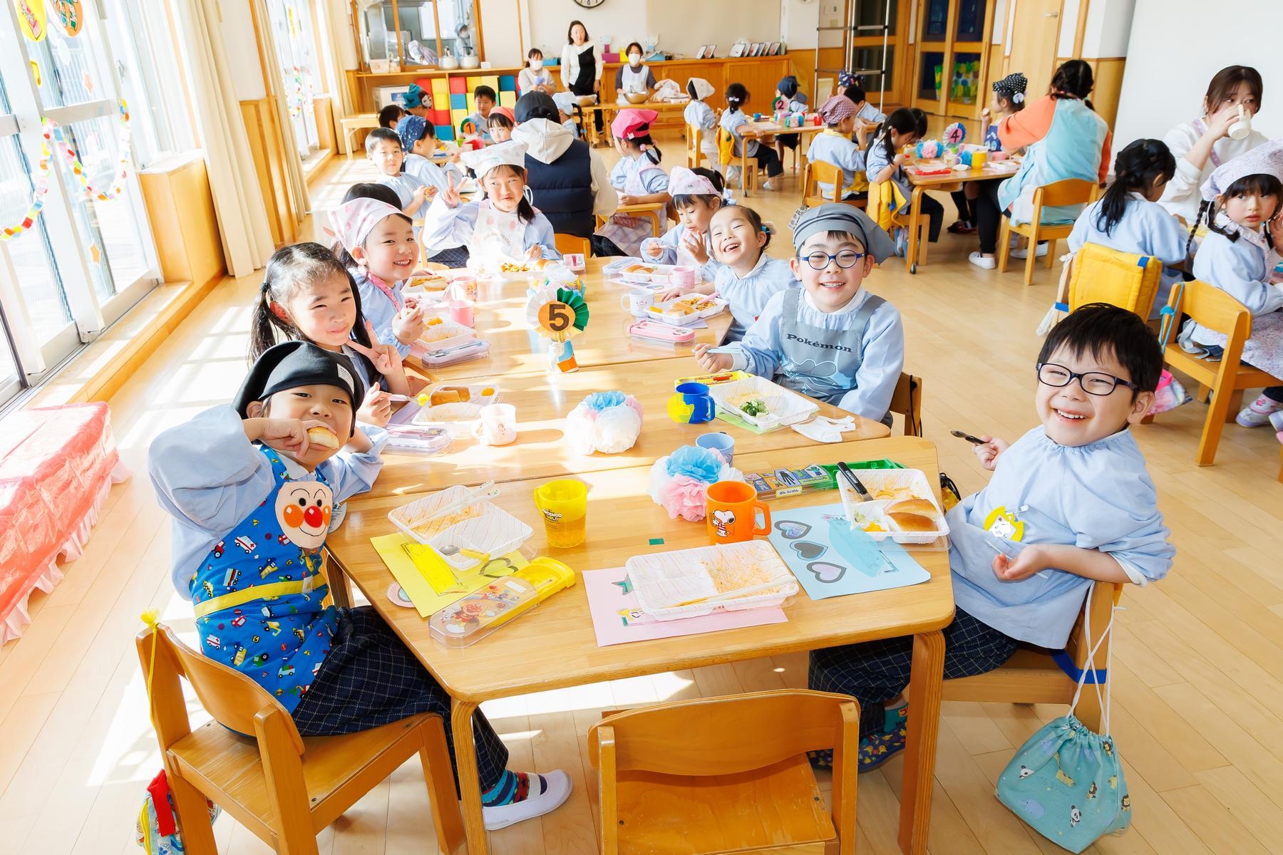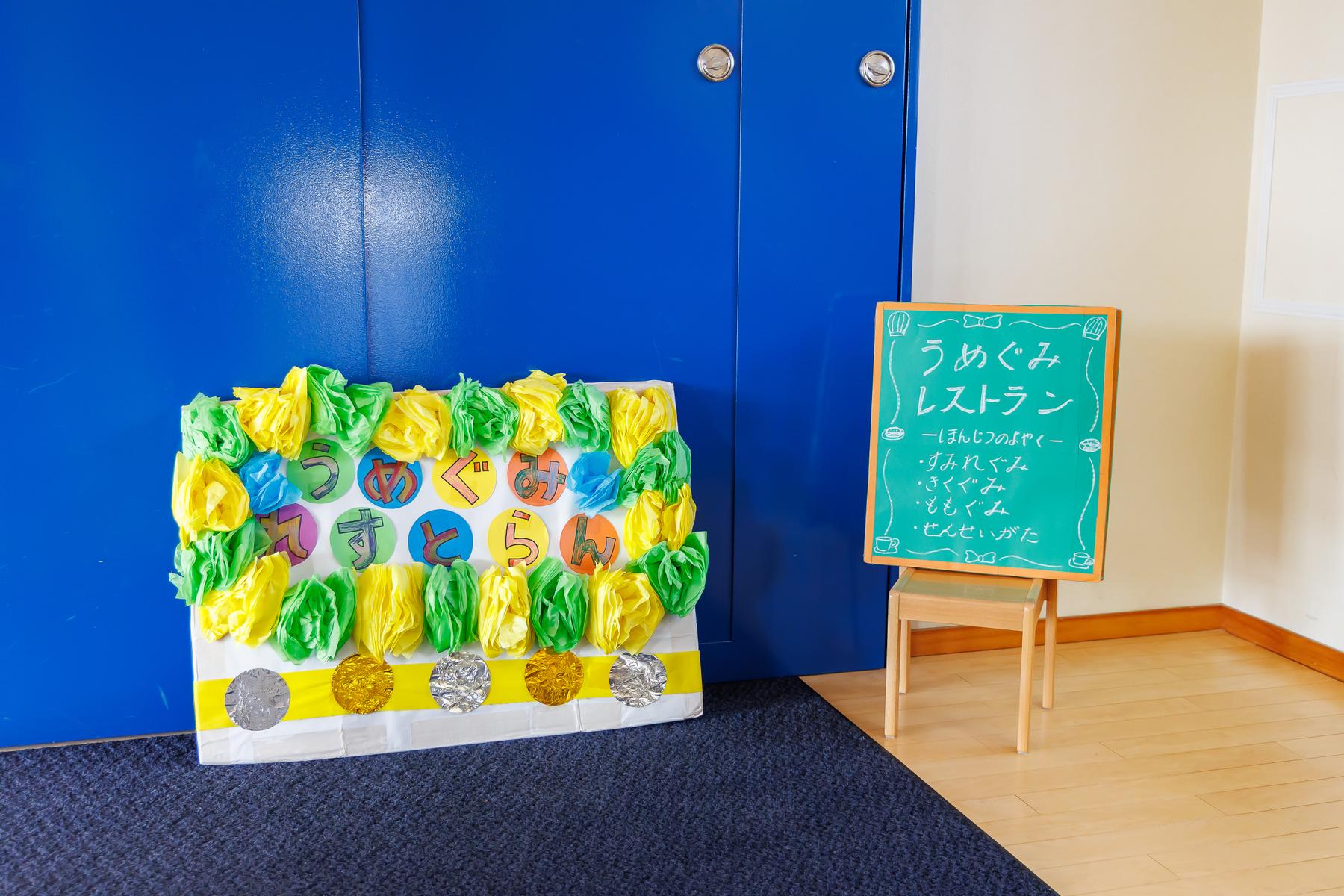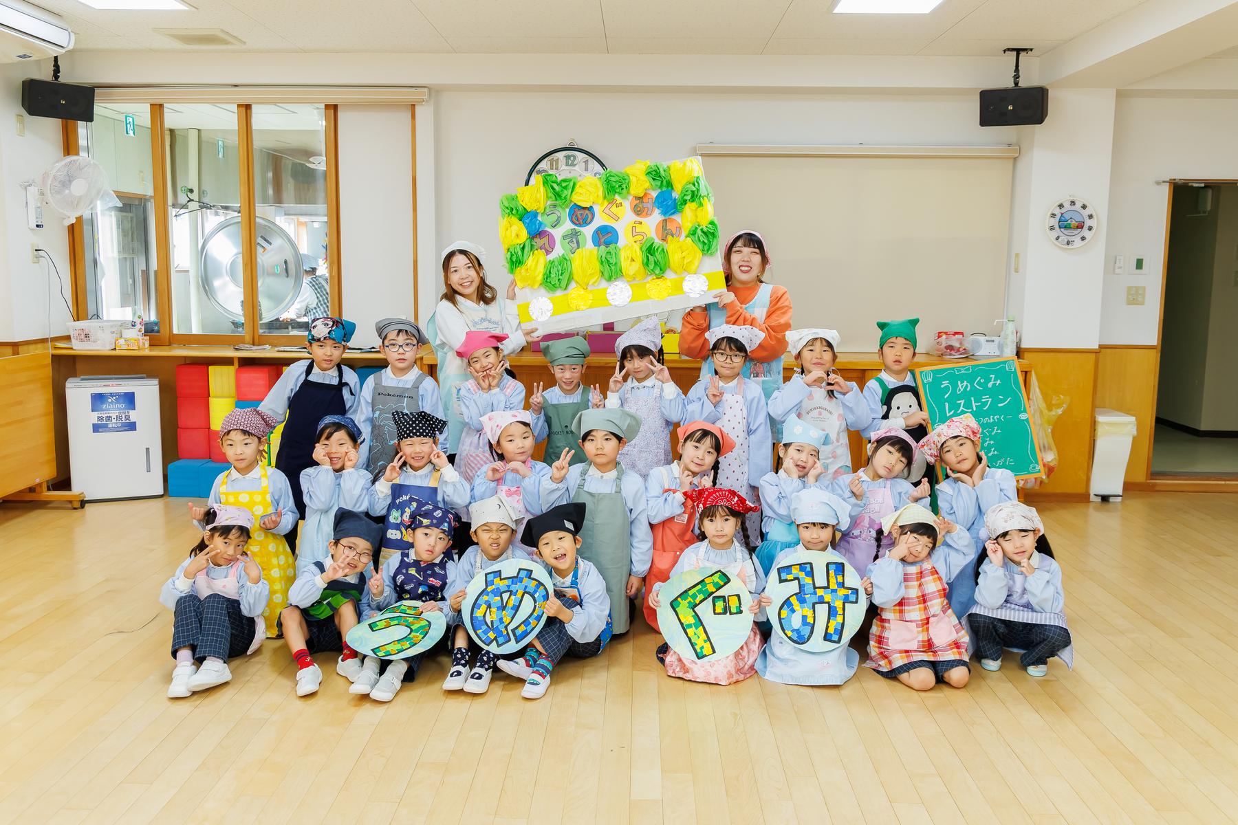 年長児が下級生に給食とおやつのおもてなしをする梅組レストラン。下級生に席の案内をしたり、注文を取ったり、ご飯やおやつを提供したりと本物の店員さんのように立ち振る舞いました。この日の為に店員さんの練習をし、その成果を存分に発揮することが出来ていました。また、初めての場所に緊張している下級生に「おいしい?」と話しかけたり、おやつの包装紙を開けてあげたりとお兄さんお姉さんの姿も見られましたよ。お家から用意してもらったお気に入りのエプロンを着て、店員さんも上手にできて、とっても嬉しそうな子どもたちでした。