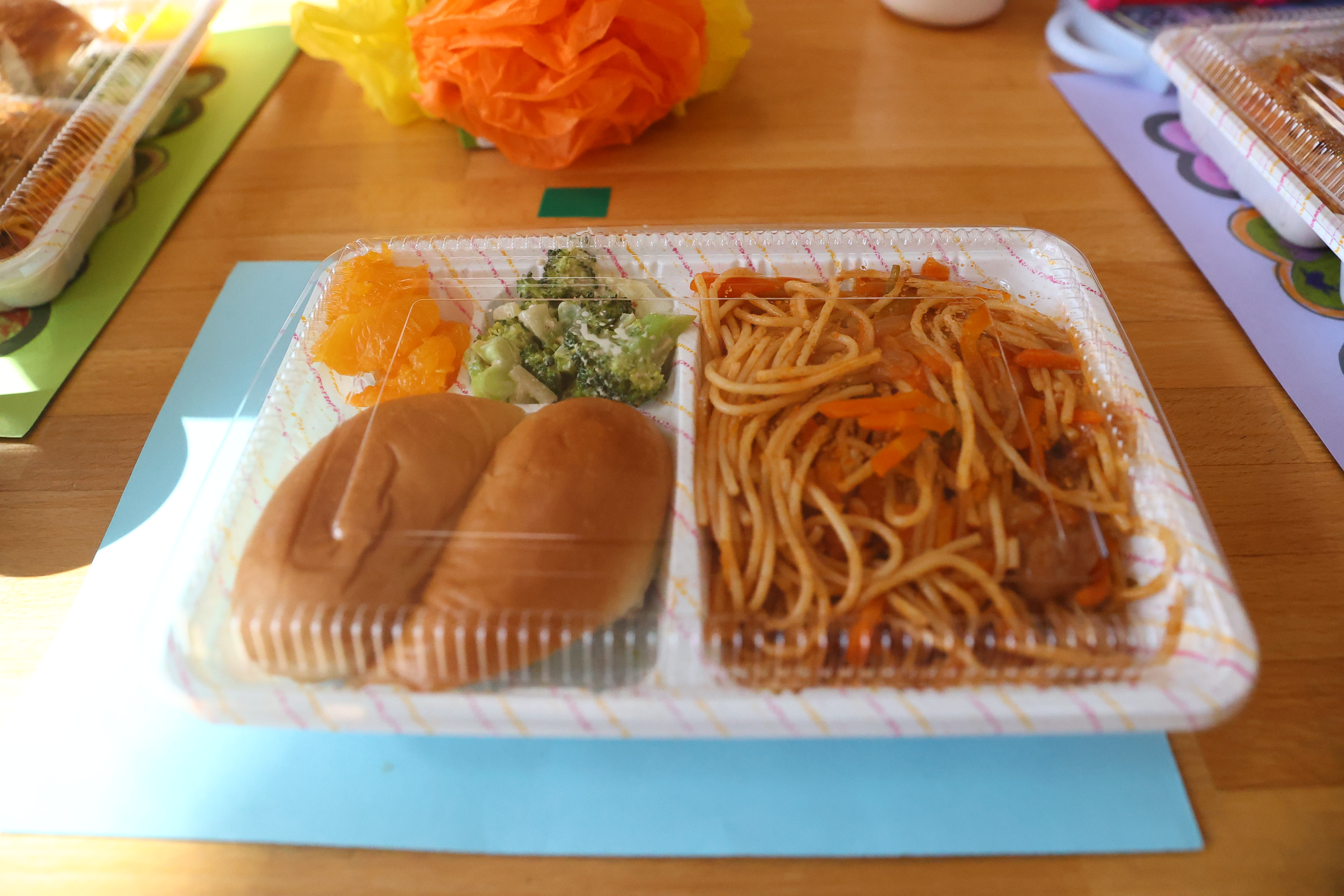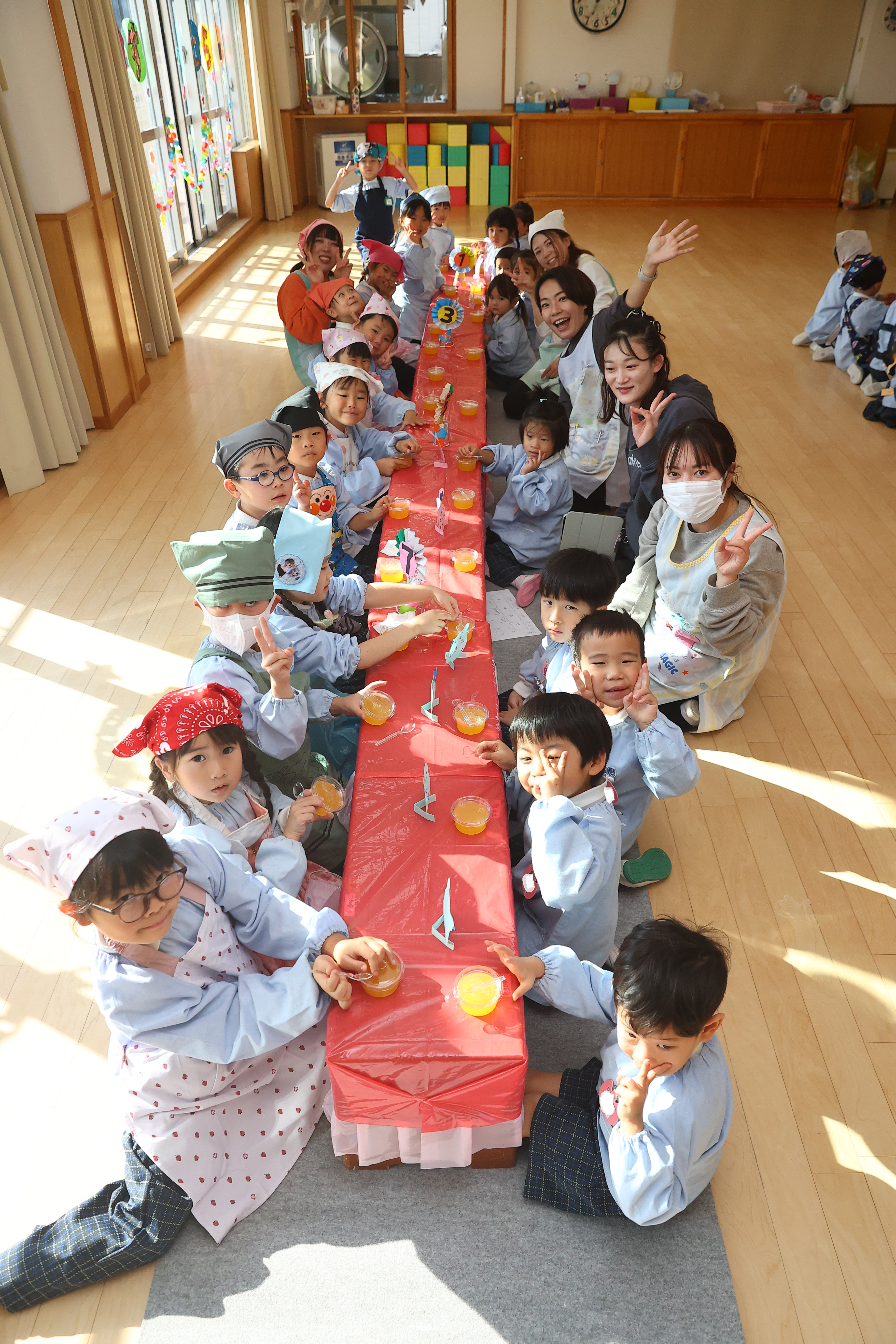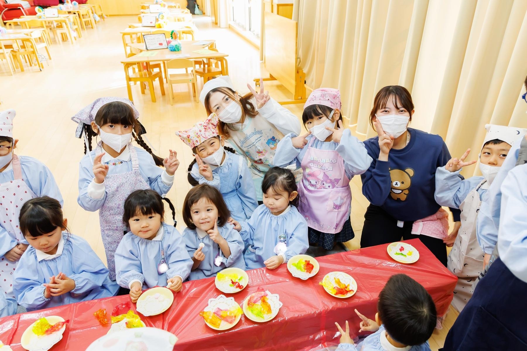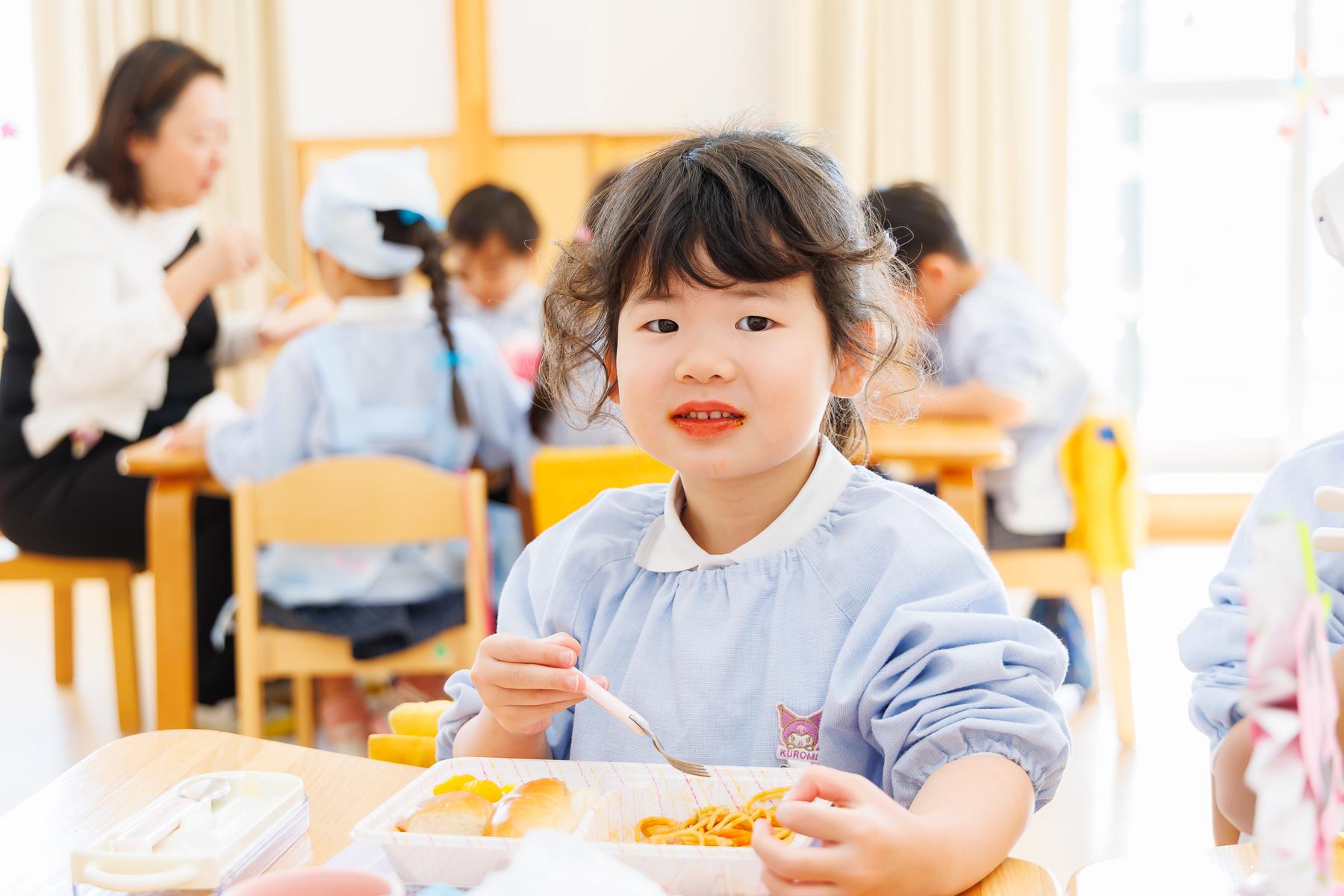 年長児が下級生に給食とおやつのおもてなしをする梅組レストラン。下級生に席の案内をしたり、注文を取ったり、ご飯やおやつを提供したりと本物の店員さんのように立ち振る舞いました。この日の為に店員さんの練習をし、その成果を存分に発揮することが出来ていました。また、初めての場所に緊張している下級生に「おいしい?」と話しかけたり、おやつの包装紙を開けてあげたりとお兄さんお姉さんの姿も見られましたよ。お家から用意してもらったお気に入りのエプロンを着て、店員さんも上手にできて、とっても嬉しそうな子どもたちでした。
